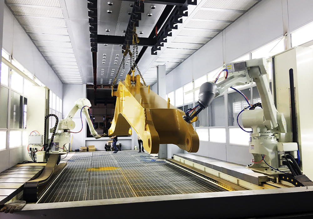 此外,挖掘机动臂斗杆喷涂自动生产线、Milan Club铲斗焊接自动生产线上,各种机器人系统正在各条生产线上有序运转。在相同产能下,每班人员仅需2人,人员减少12人,场地减少一半,物料流转次数减少3倍。